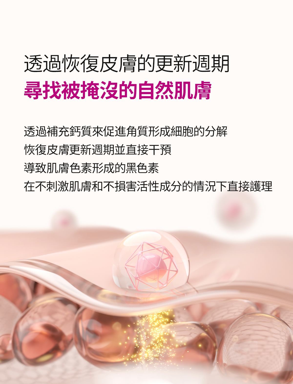 透過補充鈣質來促進角質形成細胞的分解恢復皮膚更新週期並直接干預導致肌膚色素形成的黑色素