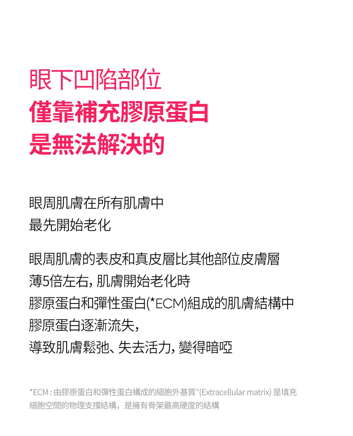 眼周肌膚在所有肌膚中,最先開始老化 眼周肌膚的表皮和真皮層比其他部位皮膚層薄5倍左右,肌膚開始老化時,膠原蛋白和彈性蛋白(*ECM)組成的肌膚結構中膠原蛋白逐漸流失,導致肌膚鬆弛、失去活力,肌膚會變得變得暗啞!