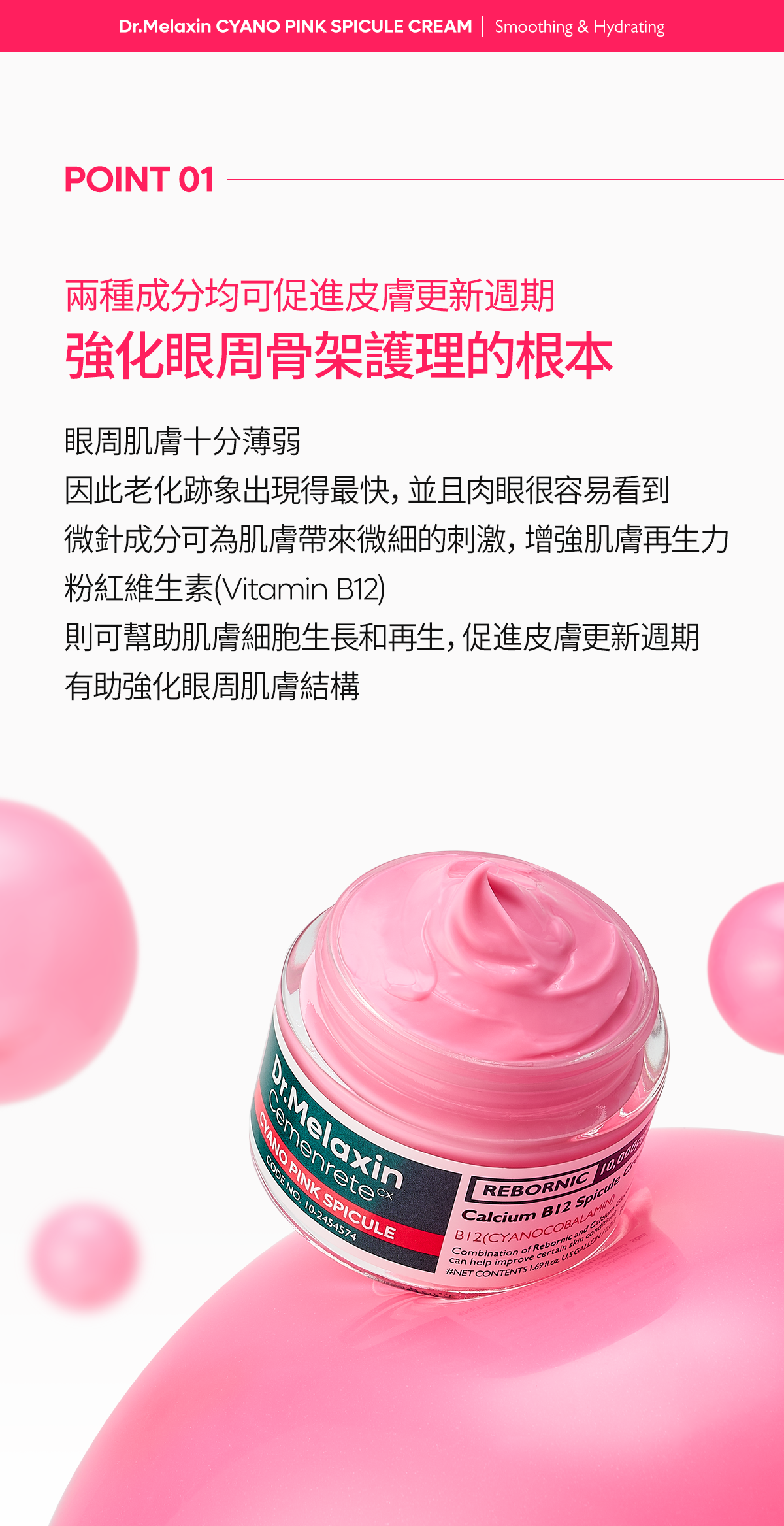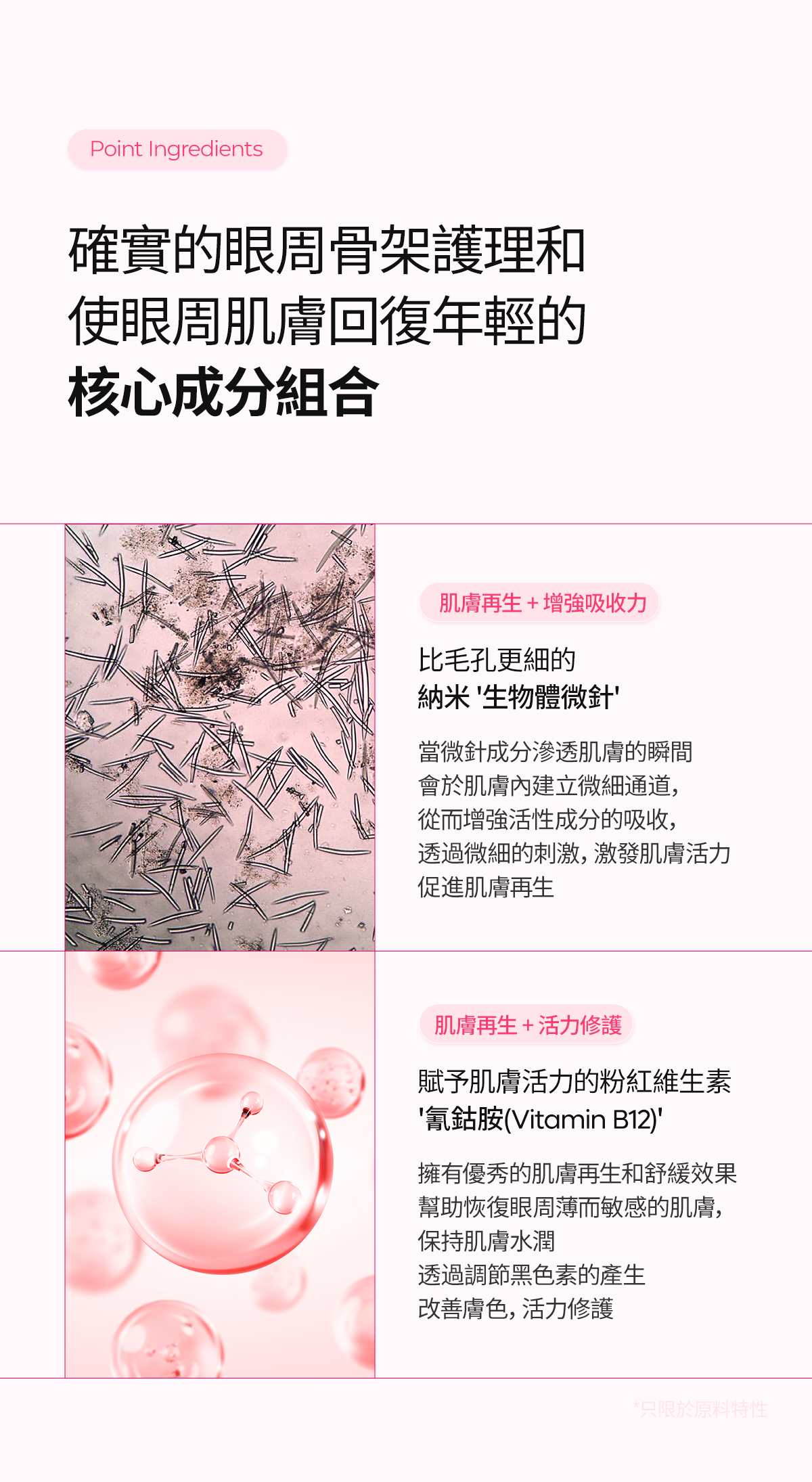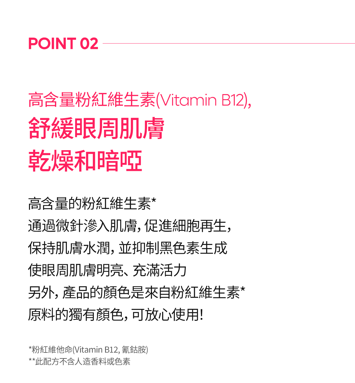 粉紅維生素(VitaminB12) 則可幫助肌膚細胞生長和再生,促進皮膚更新週期,有助強化眼周肌膚結構!