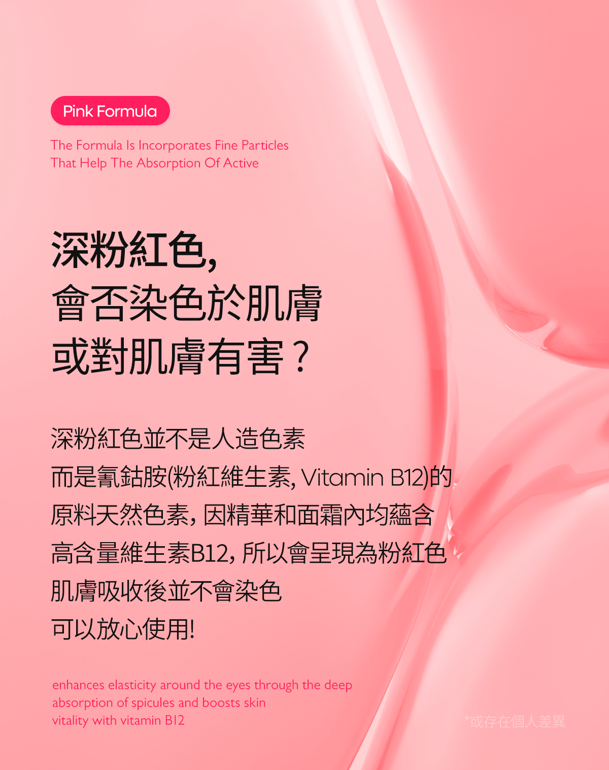 因精華和面霜內均蘊含 高含量維生素B12,所以會呈現為粉紅色 肌膚吸收後並不會染色,可以放心使用!